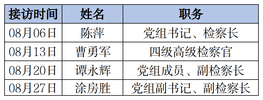为深入贯彻习近平法治思想,展现新时代检察机关践行以人民为中心的司法理念,提高12309检察服务中心的知晓度和人民满意度,推动矛盾纠纷化解,促进案结事了人和,现将全南县人民检察院2024年8月接访安排公告如下: